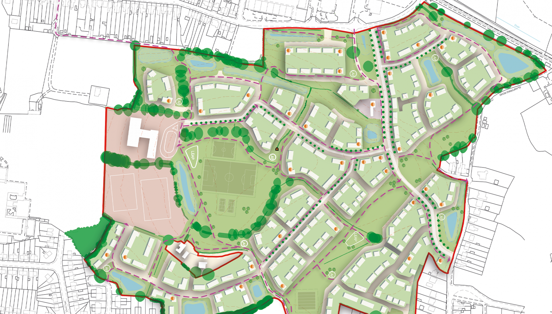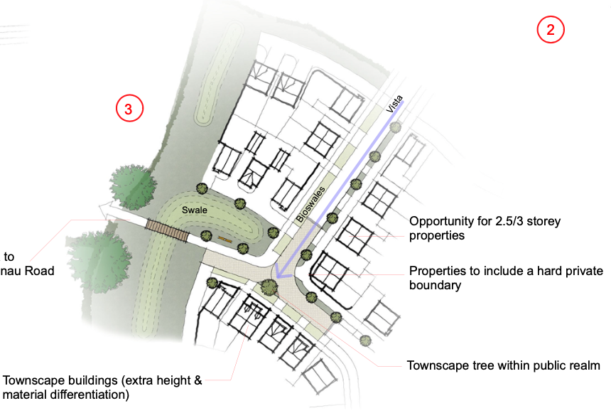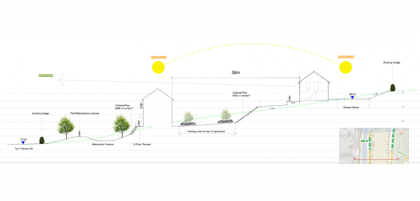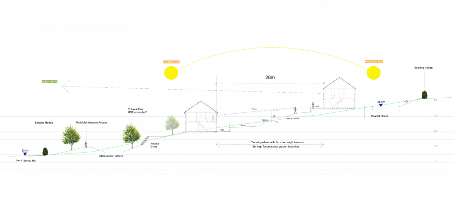 Our client required masterplanning assistance to prepare a hybrid planning application for 550 homes and a primary school on a large strategic site in Swansea. The site has a number of challenges which, in our view, presented unique placemaking opportunities. Large areas of the site are sloping (in different directions!) with steep gradients and significant green infrastructure constraints as well as the placement of a strategic water main across the site.