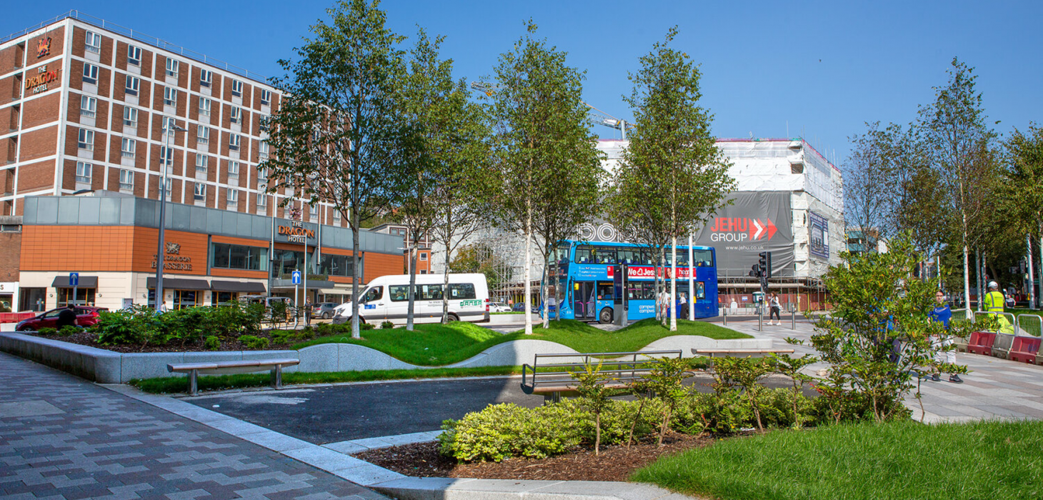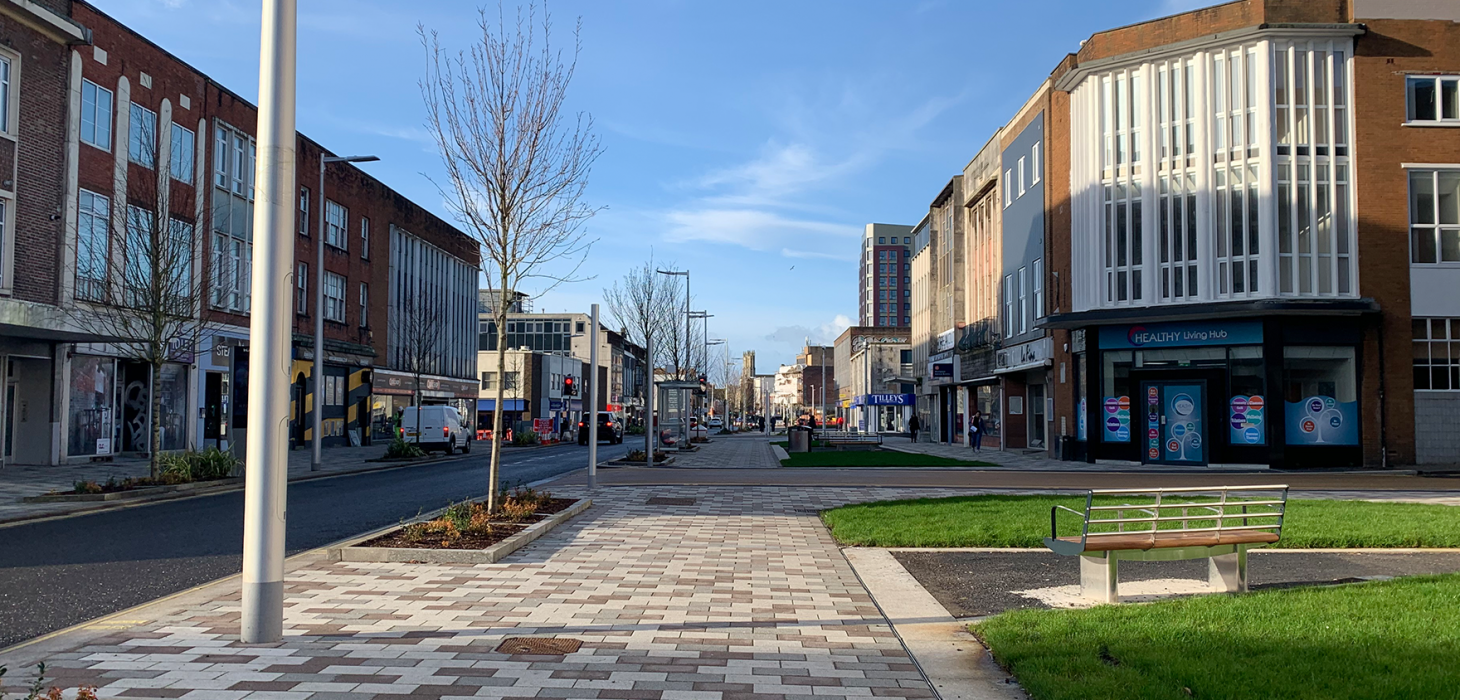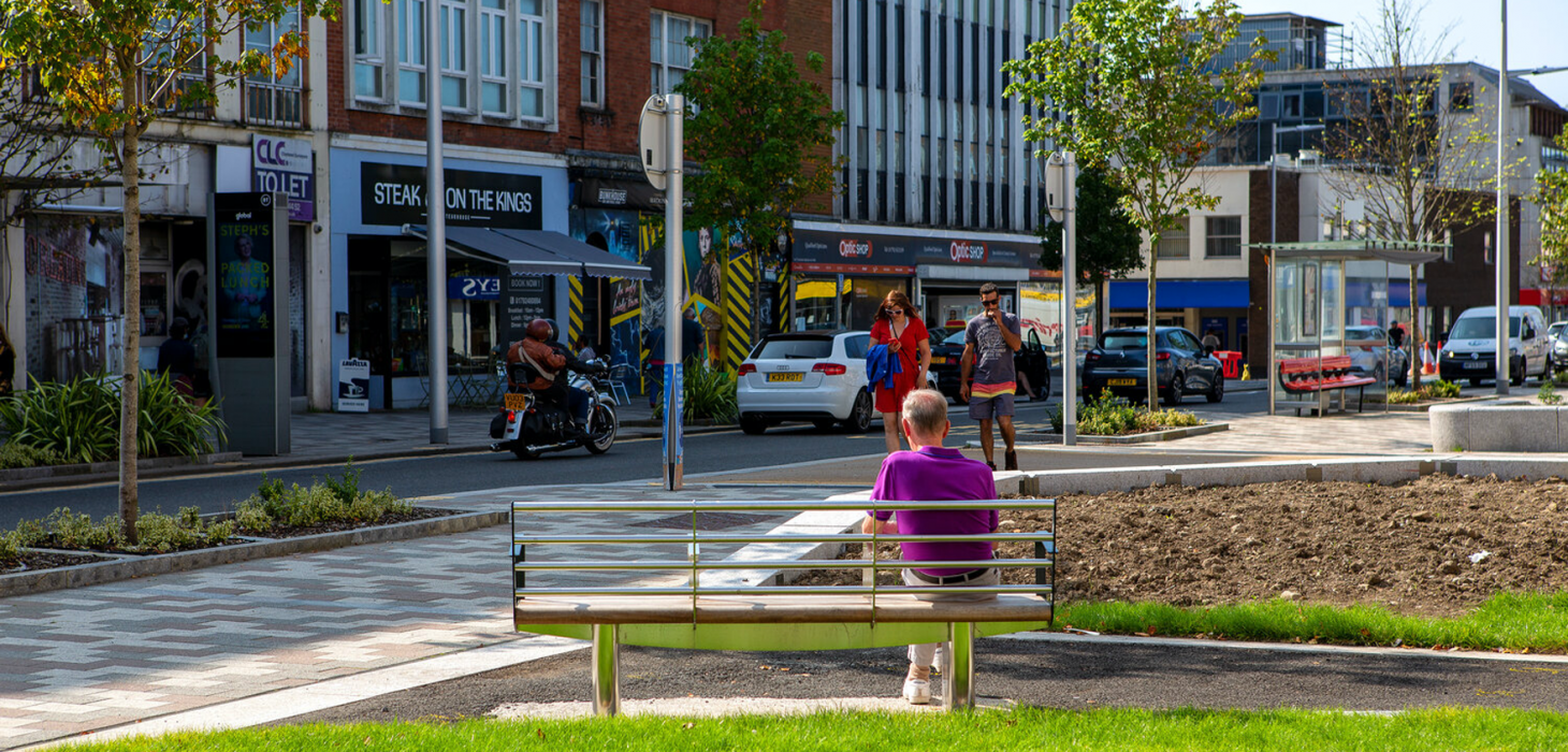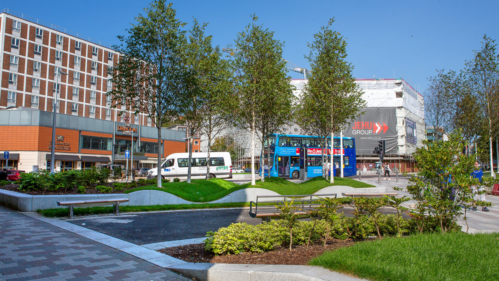 A £13m transformation of a formerly vehicle dominated road into a new green street.